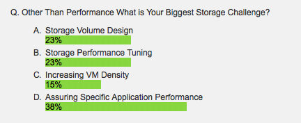 A discussion about the storage infrastructure supporting virtual servers or virtual desktops almost always starts with a focus on performance. After all, solving the much talked about I/O Blender problem often takes center stage. But according to a poll conducted in our recent webinar, “The 5 Reasons Why Storage Is Eating Away Your Virtualization ROI And How To Stop It”, volume design and assuring application performance took top votes.