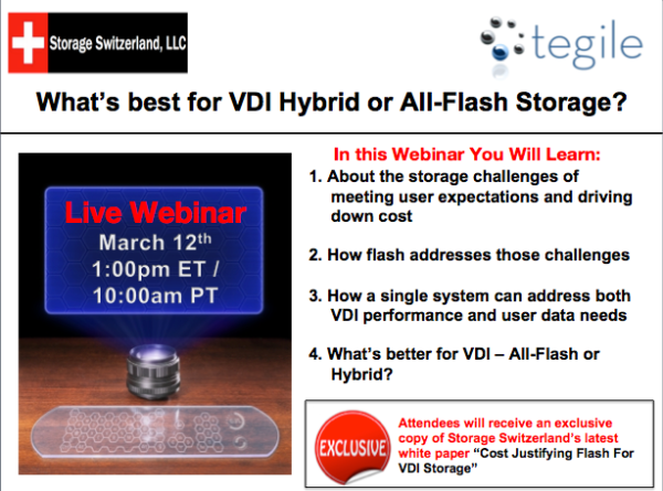 Join Storage Switzerland and Tegile for this on demand webinar to discuss the big three VDI storage problems and how to resolve them.
