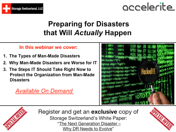 Watch Storage Switzerland and Accelerite’s on demand webinar “How To Prepare for the Disasters that Will Actually Happen”. In this webinar we discuss how these types of man-made disasters differ from natural disasters, why they’re more costly than natural disasters and what steps IT professionals must take, right now, to make sure their businesses can recover from them.