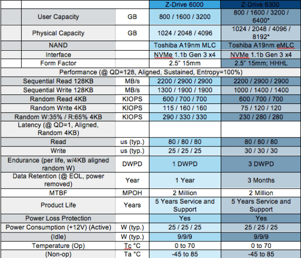 The specs for the Z-Drive 6300 SFF drive (see Table 1) are very similar to the Z-Drive 6000, with a few notable exceptions. It’s being released in the same capacities as the Z-Drive 6000, but a 6.4TB usable capacity model is expected in the second half of 2015. The Z-Drive 6300 uses Toshiba’s A19nm Enterprise MLC (eMLC) flash.