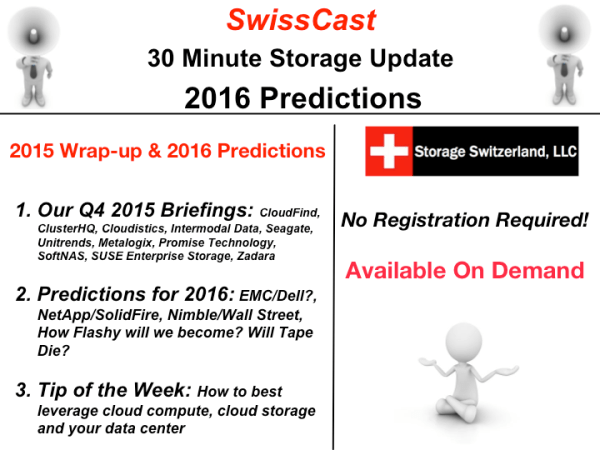 Join us for our latest SwissCast on demand. This is our 2015 wrap-up and 2016 predictions show. In this special episode we wrap up the briefings from 2015 that we didn’t get a chance to discuss and make some predictions about 2016. Learn what we think will happen with Dell/EMC, NetApp/SolidFire and Nimble vs. Wall Street. We also discuss which technologies you should take a hard look at this year and which ones should wait until next year.