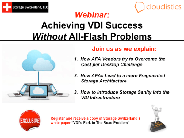 No registration required – Join Storage Switzerland and Cloudistics as we discuss the storage challenges that VDI creates and if All-Flash Arrays are the only way to solve those problems.
