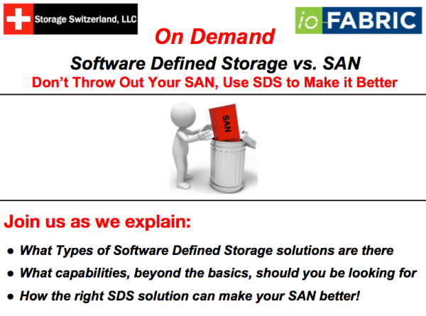 Join Storage Switzerland and ioFABRIC for this on demand webinar, “How to use Software Defined Storage to extend your SAN, not replace it”. We discuss the different types of software defined storage, why vendors want to replace your SAN instead of enhance it and what you can do to not only protect your current storage investments but also prepare a path to the future.