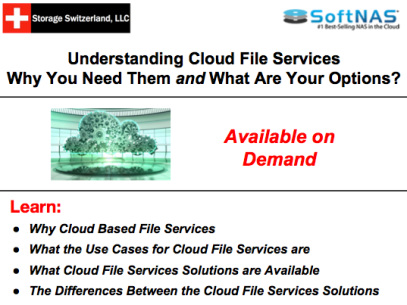 There are a number of Cloud File Services options available. Every cloud provider offers an option and there are several independent software options available. In our on demand webinar, Storage Switzerland and SoftNAS go over Cloud File Services in detail, explaining what it is, detailing the use cases and helping you sort out the differences between the various solutions. We show you how to decide if Cloud File Services are right for your organization and which of the available options is the best fit.