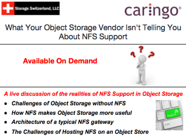 Join us for our on demand webinar, “What Your Object Storage Vendor Isn’t Telling You About NFS Support”. We discuss what object storage is, why it is better at solving modern unstructured data challenges than NFS, and why IT professionals need to pay careful attention to how their object storage vendors implement NFS compatibility.