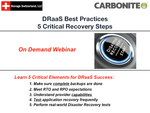 Disaster Recovery as a Service (DRaaS) offers organizations one of the most viable recovery options available to them in recent years. The ability to have an on-demand recovery site that is pre-seeded with your data should dramatically lower costs and improve recovery times, even in the worst of disasters. But IT professionals can’t take for granted that DRaaS providers will continue to cover data protection basics while also providing a seamless recovery experience. In this webinar, join Storage Switzerland Lead Analyst George Crump and Carbonite Senior Solutions Engineer Jason Earley as they provide you with the 5 Critical Recovery Steps for using DRaaS.