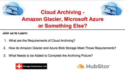 IT has a lot of questions about archiving. Is it really worth it? What should I use for archive storage? Will users embrace it? In our latest video podcast, Storage Switzerland Senior Analyst George Crump and I sit down with HubStor CEO Geoff Bourgeois to answer questions from our webinar, “Cloud Archiving – Amazon Glacier, Microsoft Azure or Something Else?” that George and Geoff did not have time go get to in that program.