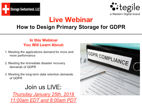 The European Union’s (EU) General Data Protection Regulation (GDPR) is forcing IT organizations worldwide to pay careful attention to their backup and recovery processes. The problem is most of these processes are already fragile and adding more responsibility may cause them to break. IT professionals should instead look to primary storage to carry more of the load. The problem here is that with the continued advancement of all-flash, primary storage is not ideal for data protection and retention because the price premium of flash media. IT professionals need to consider a mixed all-flash and hybrid disk strategy to meet the GDPR challenge.