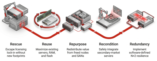 This is the environment that makes private cloud infrastructure the defining architectural decision of the next five years. Not a marketing term for a VMware cluster behind a firewall, but a real strategy. A true private cloud is a software-defined infrastructure designed to run on commodity hardware from multiple vendors. It abstracts workloads from specific server brands, CPU generations, and drive classes. The organizations that weather the supercycle will be the ones running on that kind of platform. They will live by five words: rescue, reuse, repurpose, recondition, and redundancy.